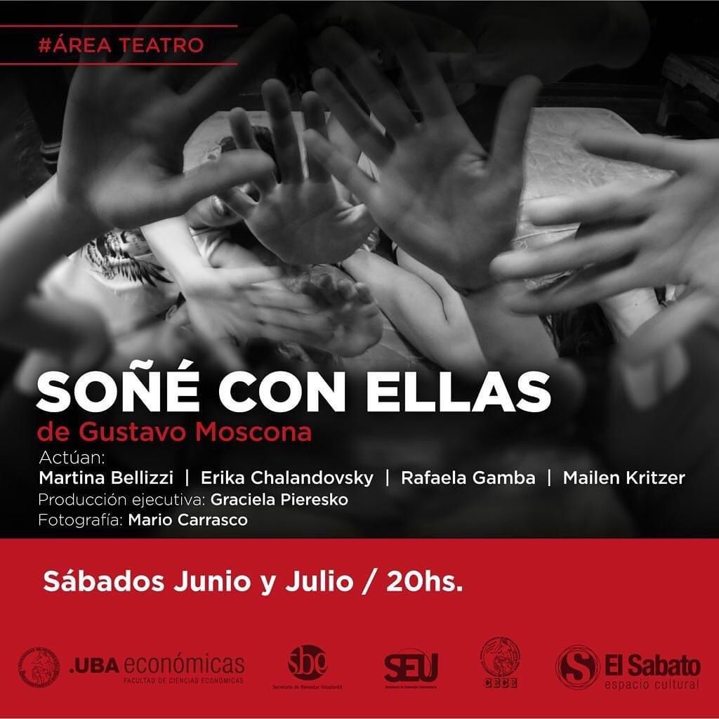 Los Sábados de Junio y Julio a las 20 horas en la Sala China Zorrilla de El Sabato Espacio Cultural de Económicas UBA (Uriburu 763-Subsuelo-CABA) se presentará la obra “Soñé con Ellas” dirigida por Gustavo Moscona y protagonizada por Martina Bellizzi, Erika Chalandovsky, Rafaela Gamba y Mailen Krtizer con la producción ejecutiva de Graciela Pieresko.